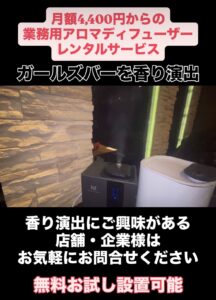 神奈川県にありますガールズバー店舗様で、香り演出をさせていただいております。 業務用アロマディフューザーレンタルサービス「MajestaFragrance」なら、月額4,400円から店舗・オフィスの香り演出が可能です。 […]